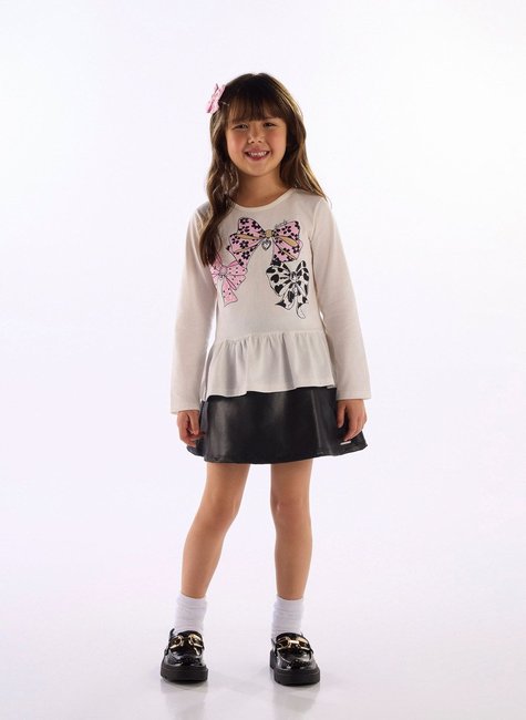 Cheia de charme e conforto, essa bata infantil feminina em meia malha 100% algodão é ideal para os dias mais fresquinhos. Com manga longa, ela conta com estampa frontal de laços e aplicação de strass que adicionam brilho ao visual. O recorte franzido na barra traz um caimento soltinho e super delicado. Perfeita para compor looks casuais com um toque especial!