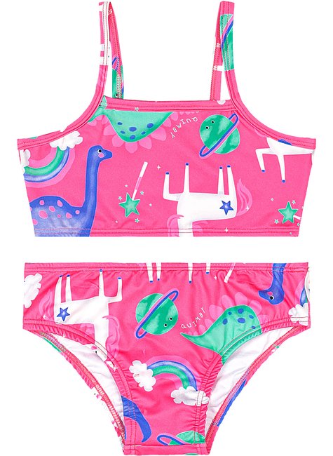 Biquíni infantil composto por top de alças e calcinha com forro, ideal para curtir os dias quentes com proteção e liberdade. Confeccionado em malha UV Dry (poliéster com elastano), o conjunto oferece fator de proteção solar FPS 50+, garantindo segurança durante a exposição ao sol. O top possui elástico na parte inferior, forro frontal e costura reforçada para melhor sustentação. A calcinha vem com elástico na cintura e nas pernas, além de forro dianteiro e traseiro para mais conforto. A estampa colorida e criativa dá um toque alegre ao visual. Uma escolha versátil, confortável e cheia de estilo para o verão.