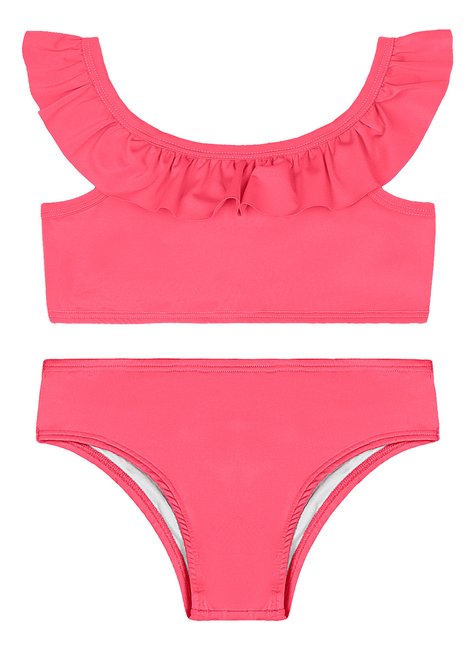 Biquíni infantil confeccionado em malha UV Dry (poliéster com elastano), com proteção solar FPS 50+, ideal para os dias de sol com mais segurança e conforto. O top com alças largas traz babado franzido na parte frontal, adicionando delicadeza e charme ao visual. Conta com forro interno para maior conforto. A calcinha é forrada na frente e atrás e possui elástico embutido na cintura e nas pernas, garantindo ótimo ajuste ao corpo. Um conjunto alegre, funcional e estiloso para aproveitar a praia ou piscina com liberdade.