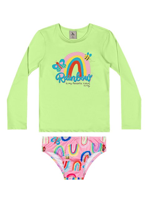 Biquíni para menina ideal para curtir o verão com conforto, estilo e proteção. O conjunto é composto por blusa de manga longa e calcinha com forro, ambas confeccionadas em malha UV Dry (poliéster com elastano), que oferece fator de proteção solar FPS 50+. A blusa possui mangas longas, costura reforçada e estampa vibrante, adicionando um toque alegre e criativo ao visual. A calcinha conta com forro frontal e traseiro, elástico embutido para ajuste perfeito e estampa rotativa que complementa o look com charme. Uma escolha versátil para praia, piscina ou atividades ao ar livre.