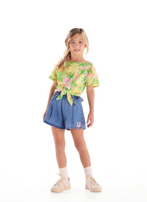 Blusa Infantil feminina, ideal para os dias quentes. Confeccionada em algodão com elastano oferecendo conforto e bem-estar, Possui manga curta, costura reforçada, amarração frontal dando um toque delicado a peça, além da estampa rotativa colorida e divertida proporcionando estilo para as meninas. Uma escolha versátil que combina com shorts, saias ou calças para um look fofo e confortável.