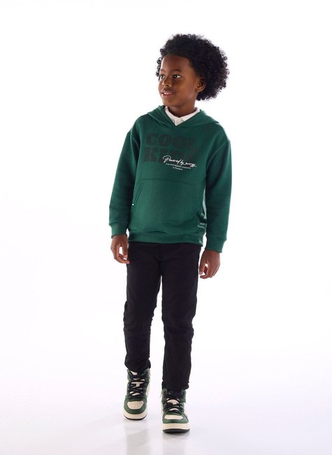 O blusão infantil masculino é ideal para os dias frios, oferecendo conforto térmico e muito estilo. Confeccionado em moletom felpado com algodão e poliéster, o modelo conta com capuz com bainha reforçada, bolso canguru funcional e acabamento em ribana nos punhos e barra para melhor ajuste. A estampa na frente com a frase Cool Kids traz personalidade ao visual. Uma peça versátil para o dia a dia ou passeios com a família.