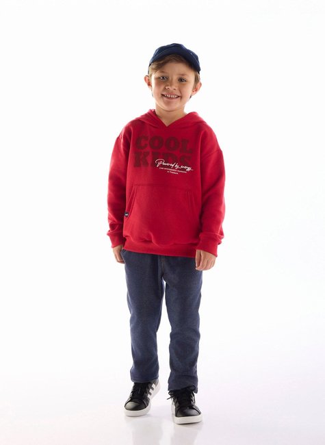 O blusão infantil masculino é ideal para os dias frios, oferecendo conforto térmico e muito estilo. Confeccionado em moletom felpado com algodão e poliéster, o modelo conta com capuz com bainha reforçada, bolso canguru funcional e acabamento em ribana nos punhos e barra para melhor ajuste. A estampa na frente com a frase Cool Kids traz personalidade ao visual. Uma peça versátil para o dia a dia ou passeios com a família.