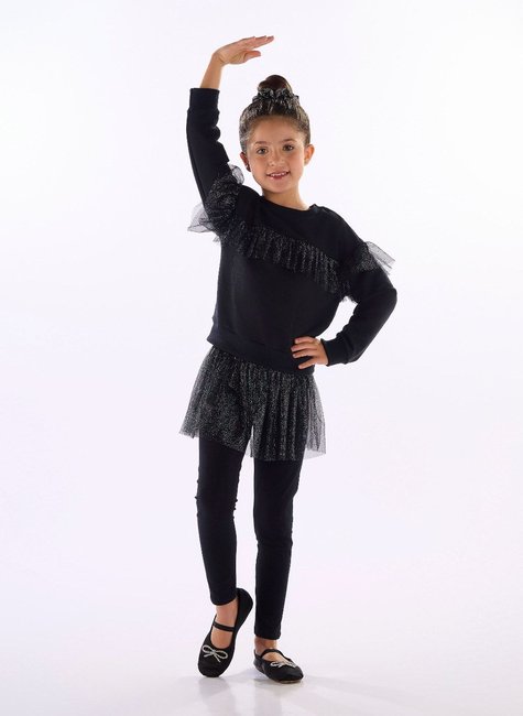 Blusão infantil confeccionado em moletom sem felpa, com detalhe em tule glitter na parte superior. Apresenta modelagem confortável, punhos em ribana e babado franzido com corte a fio.