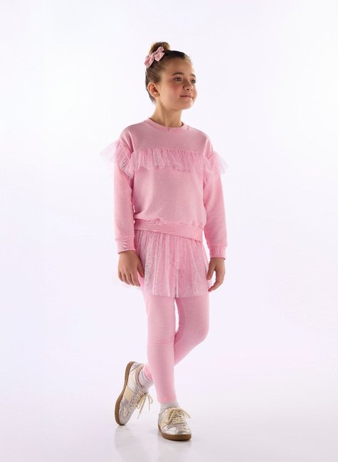 Blusão infantil confeccionado em moletom sem felpa, com detalhe em tule glitter na parte superior. Apresenta modelagem confortável, punhos em ribana e babado franzido com corte a fio.