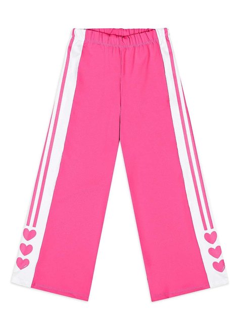 Calça esportiva infantil em malha com elastano, com recorte lateral sublimado em formato de corações. Possui elástico de 3cm na cintura e acabamento com costuras finas. Ideal para compor looks com a jaqueta ref. 34860.