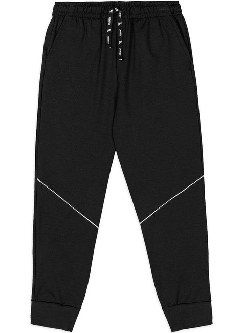 Calça infantil masculina confeccionada em malha térmica com elastano, oferecendo conforto e liberdade de movimento. Possui bolsos funcionais, vivo aplicado no recorte frontal, cós com elástico rebatido e cadarço decorativo. Os punhos moldados garantem melhor ajuste ao corpo.