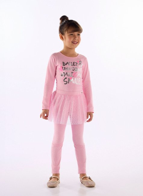 Essa legging infantil une conforto e estilo em uma peça só! Confeccionada em cotton com elastano, ela possui sobreposição de saia em tule com glitter e franzido total, trazendo um toque lúdico ao visual. Ideal para os dias de diversão com charme!