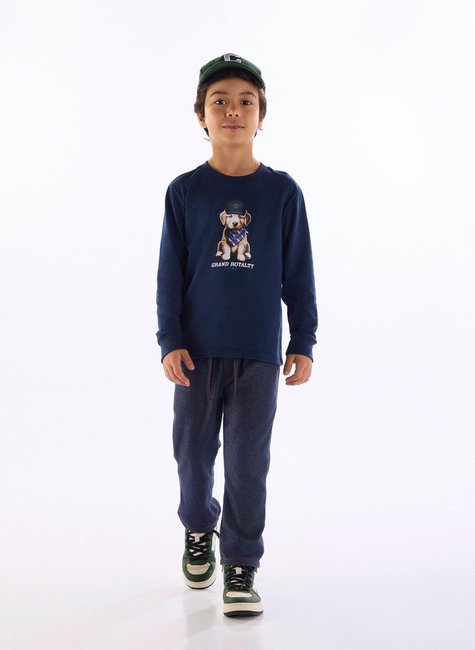 Camiseta infantil de manga longa confeccionada em malha 100% algodão. Possui estampa de alta definição com desenho de cachorro estilizado, trazendo um visual divertido e cheio de atitude para o público infantil.