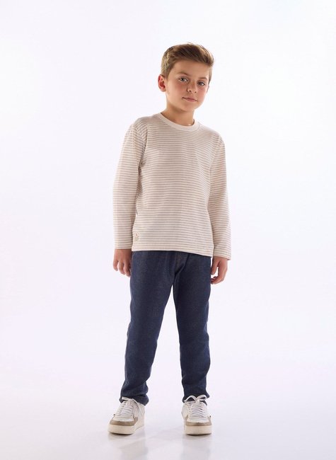 Camiseta infantil de manga longa confeccionada em cotton listrado com elastano, oferecendo toque macio e conforto ao vestir. O tecido já possui padronagem listrada, além de acabamento em debrum no decote e etiqueta decorativa aplicada na barra.