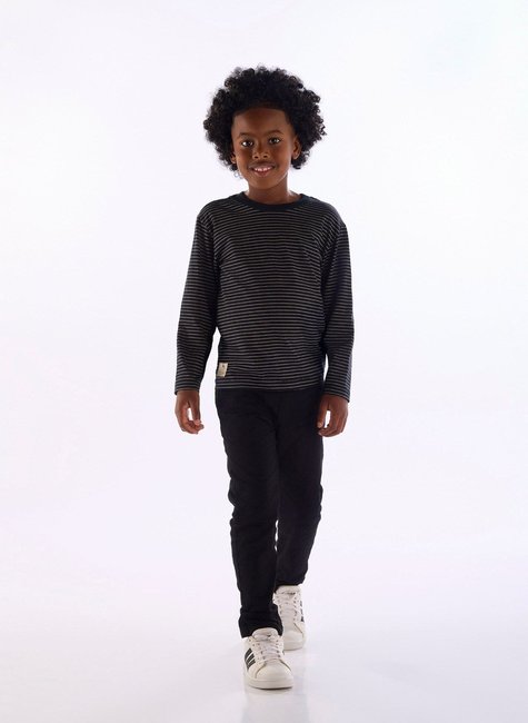Camiseta infantil de manga longa confeccionada em cotton listrado com elastano, oferecendo toque macio e conforto ao vestir. O tecido já possui padronagem listrada, além de acabamento em debrum no decote e etiqueta decorativa aplicada na barra.