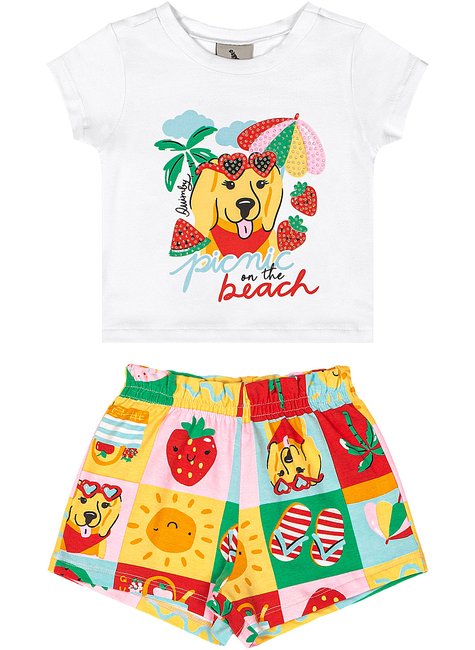 Este conjunto para bebê menina é a escolha perfeita para os dias quentes! A blusa em cotton (Algodão com elastano) leve garante conforto e apresenta uma estampa divertida com detalhe em strass, adicionando um brilho delicado. O short em cotton (Algodão com elastano) estampado possui cós clochard com elástico interno, que se ajusta suavemente ao corpo. Um look leve, alegre e cheio de estilo para o verão.