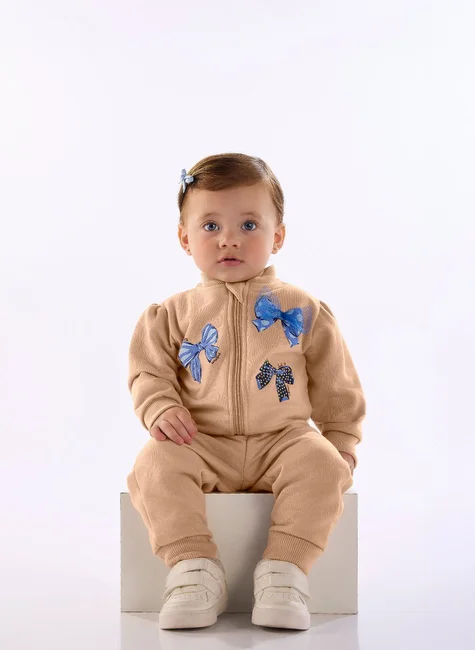 O conjunto perfeito para os dias frios! Composto por jaqueta em moletom com zíper frontal, gola em ribana e estampa de laços com strass e tule aplicado, esse look traz charme e conforto para a bebê. A calça estilo jogger possui elástico largo na cintura com amarração decorativa e punho no molde, proporcionando ajuste ideal. Ideal para passeios com estilo e liberdade de movimento.