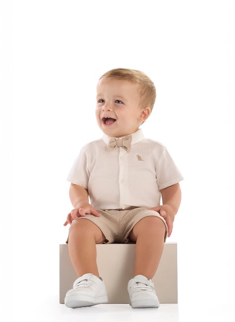 Este conjunto de festa para bebê menino combina estilo refinado e praticidade. O body em tricoline (Algodão com elastano) leve proporciona liberdade de movimento e toque suave. Com gola estruturada, abertura frontal com botões e gravata fixa, garante visual clássico para ocasiões especiais. A bermuda em tecido eco sarjado (Fibras diversas) vem com cós elástico rebatido e acabamento com pespontos aparentes, trazendo charme e segurança no vestir. Fechamento inferior por botões de pressão facilita as trocas durante o uso.