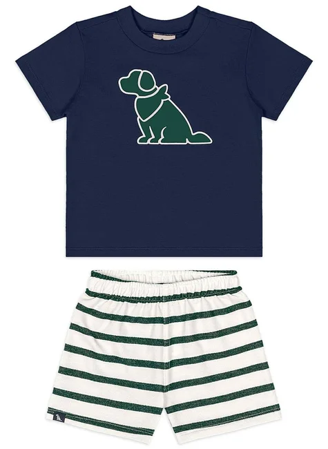 Conjunto de bebê menino composto por camiseta em meia malha de algodão e bermuda em moletom sem felpa. A camiseta possui toque suave e traz uma divertida estampa de cachorro com efeito 3D, além de acabamento com debrum no decote, que valoriza o caimento. A bermuda listrada conta com elástico rebatido e ajuste interno, além de costuras largas no gancho, garantindo liberdade de movimento e segurança para o bebê. Com design moderno e funcional, é ideal para passeios e momentos de lazer, oferecendo charme e conforto em qualquer ocasião.