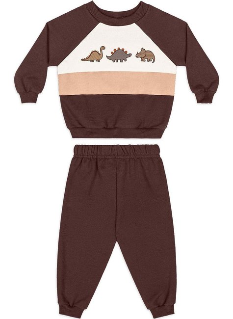 Ideal para os dias frios, este conjunto de moletom para bebê menino une conforto e praticidade em uma peça só. Composto por blusão de manga raglan e calça com elástico rebatido, oferece liberdade de movimento e fácil ajuste. Produzido em moletom felpado (algodão e poliéster), proporciona toque macio e mantém o bebê aquecido. O blusão se destaca pela estampa em 3D de dinossauros, com recortes contrastantes que dão charme extra ao visual. Os punhos e barra são em ribana, garantindo melhor caimento. Uma escolha perfeita para os passeios e atividades do dia a dia. Aposte nesta peça funcional e cheia de estilo!