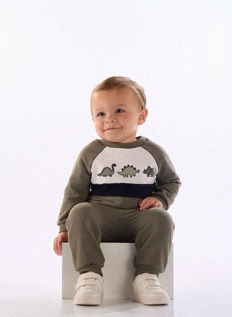 Ideal para os dias frios, este conjunto de moletom para bebê menino une conforto e praticidade em uma peça só. Composto por blusão de manga raglan e calça com elástico rebatido, oferece liberdade de movimento e fácil ajuste. Produzido em moletom felpado (algodão e poliéster), proporciona toque macio e mantém o bebê aquecido. O blusão se destaca pela estampa em 3D de dinossauros, com recortes contrastantes que dão charme extra ao visual. Os punhos e barra são em ribana, garantindo melhor caimento. Uma escolha perfeita para os passeios e atividades do dia a dia. Aposte nesta peça funcional e cheia de estilo!