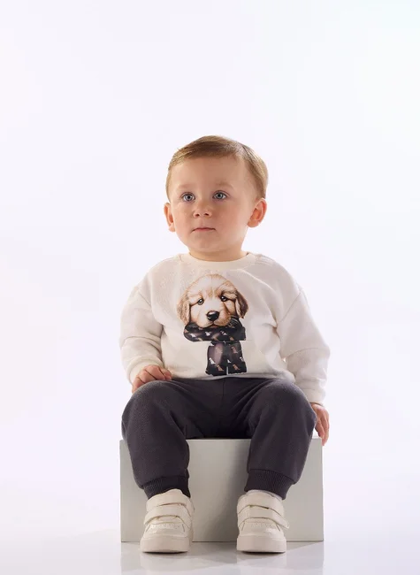 Conjunto para bebê menino, confeccionado em moletom felpado de algodão com poliéster. O blusão em moletom felpado possui arte termocolante de filhote de cachorro, bolso canguru e acabamento reforçado em ribana. A calça conta com cós e barras em elástico rebatido, oferecendo o mesmo conforto e acompanhando os movimentos do bebê no dia a dia. Ideal para passeios e momentos de lazer, é uma opção prática e fofa para o inverno.