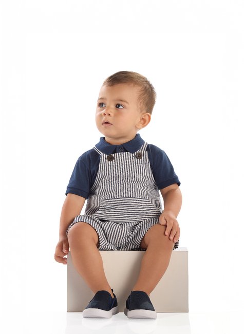 Conjunto menino bebê, possui camisa polo em algodão sendo fresquinha, macia e perfeita para os dias de calor, contém gola e punhos em retilínea, abotoamento frontal e costura reforçada trazendo um toque clássico ao look. Acompanhado da jardineira confeccionada em tecido viscose listrado que adiciona estilo e leveza, possui etiqueta personalizada, bolso canguru, alças que passam por caseados e fechamento com botões de pressão entre as pernas, facilitando na hora de vestir e trocar. Ideal para passeios, eventos em família ou até ocasiões mais formais.