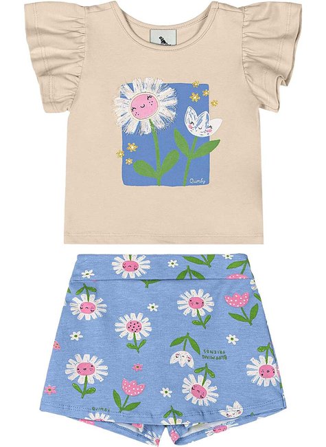 Conjunto para bebê menina com blusa estampada com glitter, que traz brilho e alegria ao visual. Acompanha short-saia floral confeccionado em cotton leve, ideal para garantir conforto e liberdade nos movimentos. Uma combinação delicada e charmosa, perfeita para deixar a bebê estilosa em qualquer ocasião.