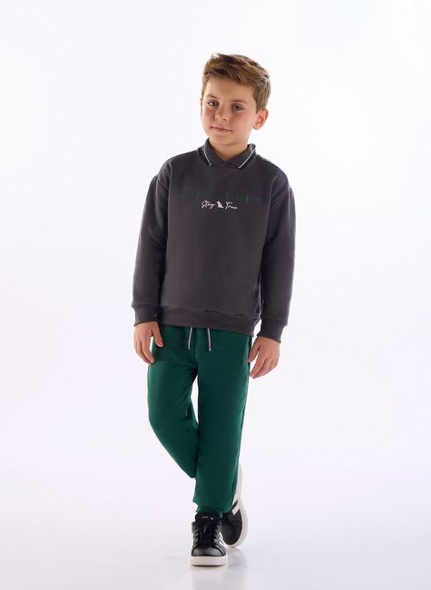 Conjunto infantil masculino confeccionado em moletom felpado, ideal para os dias frios. O blusão apresenta estampa localizada, acabamento em debrum no decote e na barra, garantindo um visual mais refinado. A calça possui cós com elástico, cadarço funcional e punhos ajustados, proporcionando conforto e liberdade de movimento.