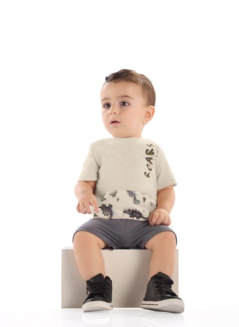 Conjunto para menino, Criado para unir diversão e conforto. A camiseta, feita em algodão, é leve e perfeita para os dias quentes de verão. Possui bolso frontal estampado com dinossauros, estampa no peito com escrita junto com o nome da marca, contém gola arredondada em ribana e mangas curtas. A bermuda é confeccionada em moletom sem felpa, e conta com elástico na cintura, oferecendo conforto e permitindo total liberdade de movimento. Peças ideais para passeios, brincadeiras e momentos em família.