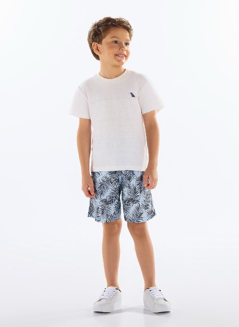 Este conjunto infantil é ideal para seu pequeno usar em dias quentes! Composto por uma camiseta em meia malha flamê (algodão), com estampa em 3D e recorte na parte da frente, gola redonda em ribana canelada e acabamentos com costura dupla. Acompanhada por uma bermuda com estampa tropical, confeccionada em viscose com elastano, possui cós elástico com cadarço funcional na cintura e bolsos laterais. Peças leves e confortáveis, perfeitas para acompanhar o dia-a-dia dos pequenos.