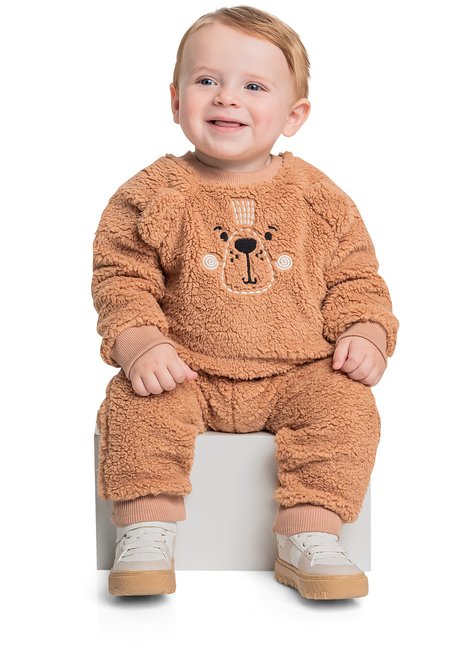 Conjunto para bebê menino, confeccionado em pelo sintético macio e aconchegante. O blusão destaca-se pela manga raglan que proporciona um ajuste confortável e pelo bordado de ursinho com orelhas, adicionando um toque lúdico e carinhoso a peca. A calca, com elástico na cintura, garante praticidade e conforto para o dia a dia.