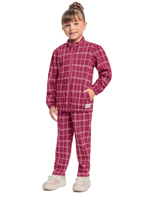Conjunto infantil para menina, confeccionado em malha jacquard xadrez. A jaqueta possui gola alta, fechamento por zíper para maior praticidade, elástico nas mangas para um ajuste confortável e bolsos laterais. A calca conta com um cós clochard com elástico, garantindo um ajuste perfeito e estiloso, além de bolsos práticos.
