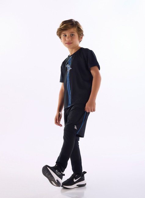 Conjunto esportivo infantil masculino composto por três peças: camiseta, bermuda e calça. Confeccionado em malha dry fit com elastano, proporciona conforto e liberdade de movimentos. Possui estampa frente e costas na camiseta, aplicação refletiva, acabamento em debrum e cós com cadarço funcional.