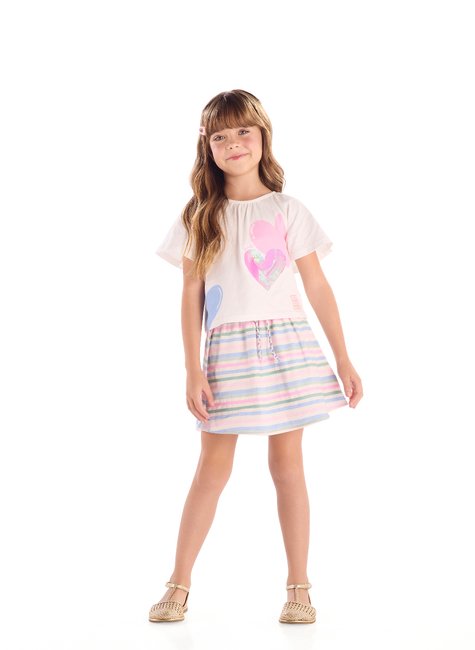 Conjunto infantil confeccionado em algodão, que traz delicadeza para quem busca um visual alegre e confortável. A blusa possui estampa de coração com detalhe em bordado, manga curta franzida, acabamento reforçado e etiqueta decorativa. Acompanha uma saia em tecido listrado com short interno embutido, que proporciona total liberdade de movimento. Conta ainda com elástico na cintura e cadarço decorativo, sendo uma escolha versátil e ideal para passeios, festas ou momentos casuais.