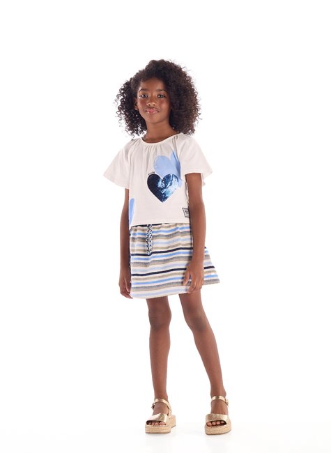 Conjunto infantil confeccionado em algodão, que traz delicadeza para quem busca um visual alegre e confortável. A blusa possui estampa de coração com detalhe em bordado, manga curta franzida, acabamento reforçado e etiqueta decorativa. Acompanha uma saia em tecido listrado com short interno embutido, que proporciona total liberdade de movimento. Conta ainda com elástico na cintura e cadarço decorativo, sendo uma escolha versátil e ideal para passeios, festas ou momentos casuais.