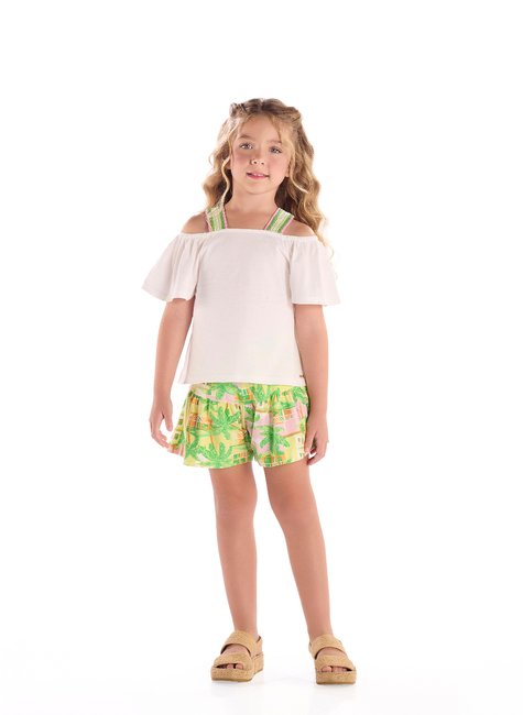 Um conjunto encantador e superconfortável para os dias de calor! A bata é confeccionada em meia malha (Algodão) e apresenta alças coloridas com elástico, além de mangas com recorte em babado que deixam o look leve e romântico. O short em cotton (Algodão com elastano) estampado completa a produção com padronagem tropical e recorte com babados, tornando-o ideal para passeios ou ocasiões especiais.