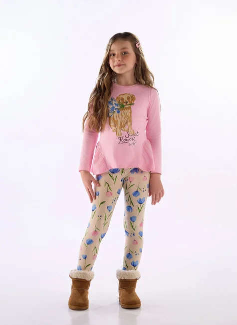 O conjunto perfeito para as meninas que adoram conforto e estilo! A blusa de manga longa em cotton vem com um babado franzido na barra e estampa fofa de cachorrinha com strass delicado. A legging estampada floral completa o visual com um toque alegre e divertido ideal para dias fresquinhos.