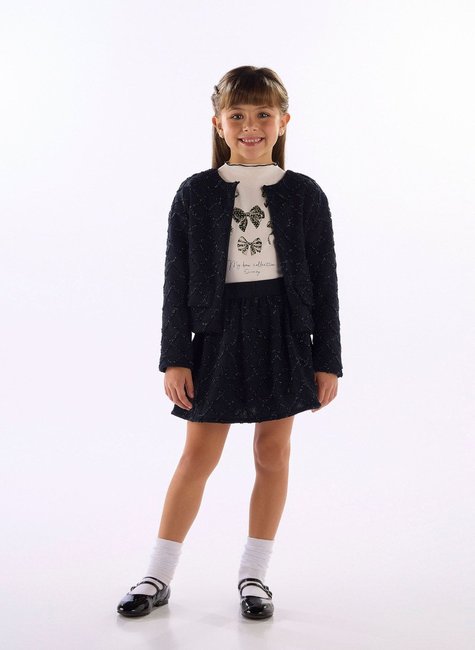 Este conjunto é a união perfeita de conforto e charme para as pequenas! A blusa em cotton possui abertura com detalhe de babado (fru fru), estampa com laços e aplicação de strass. Acompanha saia em malha trabalhada com short interno embutido em meia malha, garantindo liberdade nos movimentos e segurança no uso.