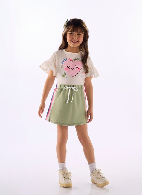 Conjunto infantil feminino composto por blusa em meia malha com estampa de coração e aplicação de strass, mangas franzidas com acabamento delicado, e bainha dupla. O short-saia é confeccionado em moletom leve, com cadarço decorativo, recortes laterais com estampa colorida e short interno para maior conforto.