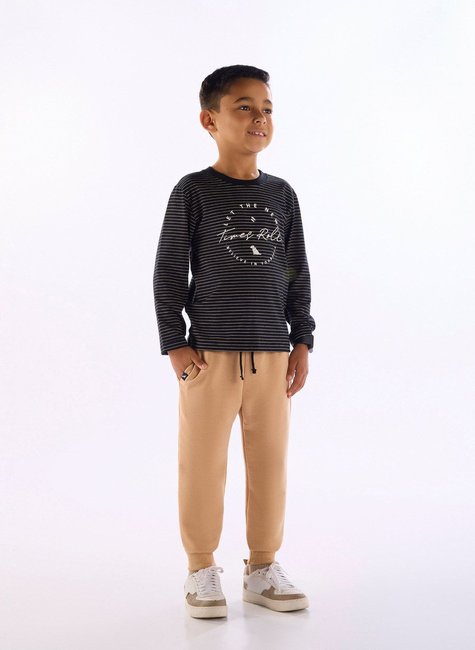 Conjunto infantil masculino composto por camiseta em cotton listrado com estampa em 3D e calça em moletom sem felpa. A calça possui cós com elástico rebatido, cadarço decorativo e bolsos funcionais. O modelo conta ainda com etiqueta bordada e acabamento em debrum nas barras.