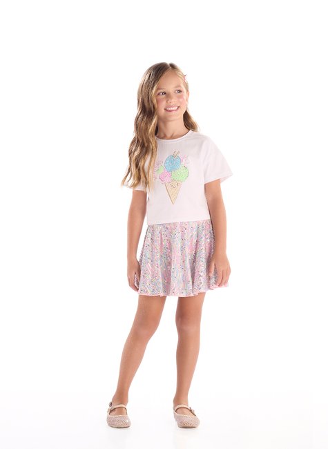 Um conjunto encantador, repleto de brilho e delicadeza, criado para iluminar os dias das pequenas com muito charme e estilo. A blusa, confeccionada em cotton (Algodão com elastano) branco macio, traz uma estampa divertida de sorvete, realçada por aplicações de strass que adicionam um toque de delicadeza e sofisticação. A saia, toda em paetê (Poliéster com elastano) coloridos, transforma o visual em algo fashion, alegre e vibrante, garantindo aquele destaque especial em qualquer ocasião. Para completar, o short interno em meia malha (Algodão) assegura liberdade nos movimentos e conforto durante todo o uso, permitindo que as meninas brinquem e se divirtam com tranquilidade.