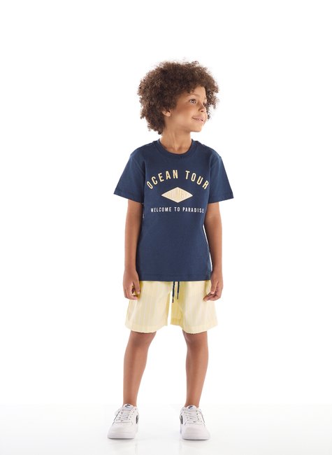Conjunto Infantil Masculino, conta com camiseta confeccionada em algodão, possui gola arredondada em ribana, mangas curtas, costura reforçada, apresenta estampa em 3D escrita Ocean Tour, trazendo estilo extra ao visual. Acompanha bermuda em microfibra com elastano que oferece conforto e mobilidade, contém bolso funcional, elástico e cadarço funcional na cintura, que garantem ajuste perfeito. Peças ideais para passeios, escola e momentos de lazer.