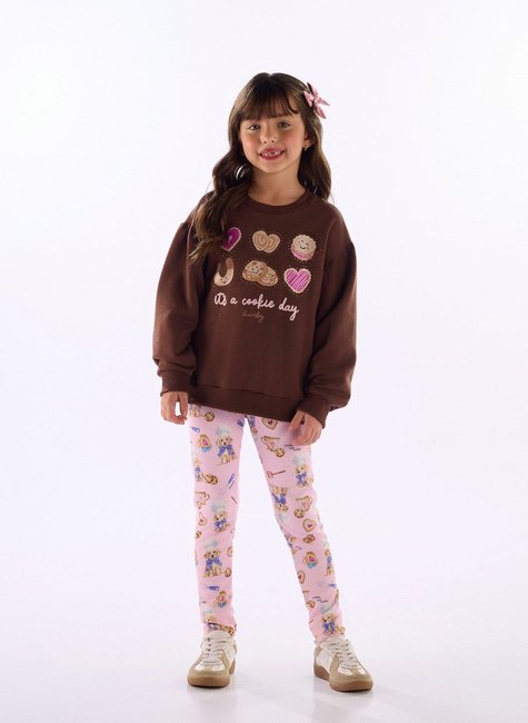Encante com este conjunto infantil feminino, perfeito para os dias frios. O blusão em moletom felpado traz estampa frontal com tema de doces, aplicação de strass e franzido delicado nos ombros, garantindo um visual meigo e divertido. A legging em suedine felpado possui estampa sublimada que adiciona cor e alegria ao look. Conforto, estilo e aquecimento para acompanhar a rotina da menina com muito charme.