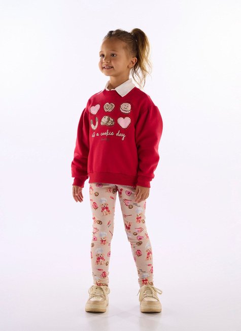 Encante com este conjunto infantil feminino, perfeito para os dias frios. O blusão em moletom felpado traz estampa frontal com tema de doces, aplicação de strass e franzido delicado nos ombros, garantindo um visual meigo e divertido. A legging em suedine felpado possui estampa sublimada que adiciona cor e alegria ao look. Conforto, estilo e aquecimento para acompanhar a rotina da menina com muito charme.