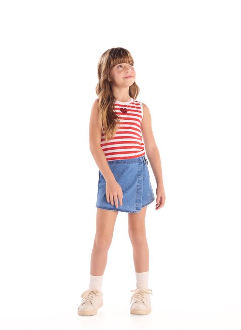 Encantador e cheio de estilo, este conjunto infantil feminino foi desenvolvido para unir conforto, praticidade e um toque fashion no guarda-roupa das meninas. A regata cropped listrada em ribana (Algodão) oferece caimento leve, respirabilidade e frescor, perfeita para os dias mais quentes, além de trazer um visual moderno e descontraído. O detalhe de patch termocolante de paetê em formato de coração adiciona delicadeza e charme, deixando a peça ainda mais especial. Para complementar, o short-saia jeans com elastano (Algodão, poliéster e elastano) proporciona liberdade total de movimentos e caimento impecável, enquanto o laço lateral dá um toque atual e super feminino ao look.