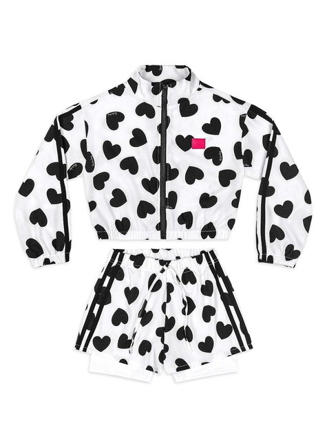 Conjunto infantil feminino composto por jaqueta com zíper frontal e short com cadarço funcional, ambos confeccionados em microfibra leve com elastano. A estampa sublimada de corações adiciona um toque divertido e moderno. Ideal para atividades esportivas ou momentos de lazer.