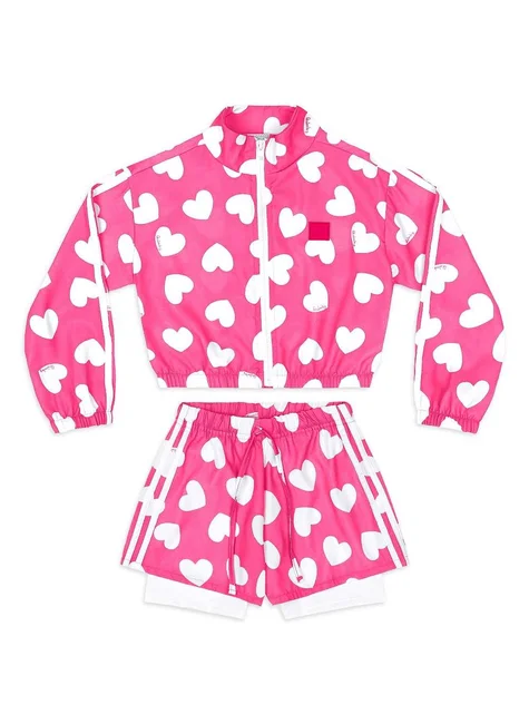 Conjunto infantil feminino composto por jaqueta com zíper frontal e short com cadarço funcional, ambos confeccionados em microfibra leve com elastano. A estampa sublimada de corações adiciona um toque divertido e moderno. Ideal para atividades esportivas ou momentos de lazer.