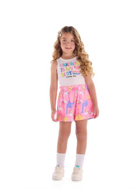 Conjunto para menina que oferece estilo e conforto para os dias mais quentes. A regata, confeccionada em ribana canelada, possui costura reforçada e uma estampa lúdica de unicórnio com detalhe em strass. Acompanha um short em cotton (algodão com elastano) que proporciona bem-estar e caimento confortável. O short se destaca pelo charmoso cós clochard com elástico embutido, que garante liberdade de movimento, e pela divertida estampa rotativa de unicórnios e dinossauros. É uma escolha versátil para passeios, festas ou momentos de lazer.