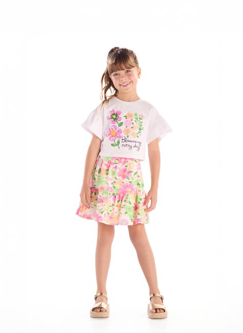 Conjunto para menina composto por blusa em tecido de algodão e saia em cotton com short interno também em algodão. A blusa apresenta cava levemente deslocada com babado franzido nas mangas e estampa de flores bordadas em paetê delicado. A saia rodada possui elástico na cintura, recorte franzido na frente e nas costas e estampa floral por toda a peça. Perfeito para passeios e ocasiões especiais, une estilo e delicadeza para acompanhar a pequena em qualquer momento.