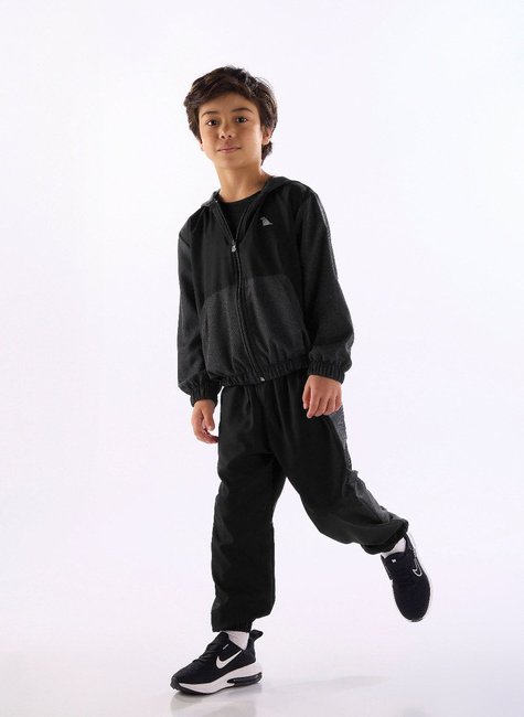 Conjunto infantil composto por jaqueta tipo corta-vento com capuz e calça jogging. Confeccionado em microfibra com elastano com toque macio, apresenta recortes sublimáticos, bolso funcional, zíper frontal e elástico confortável. Ideal para acompanhar os meninos com estilo e proteção nos dias frios.