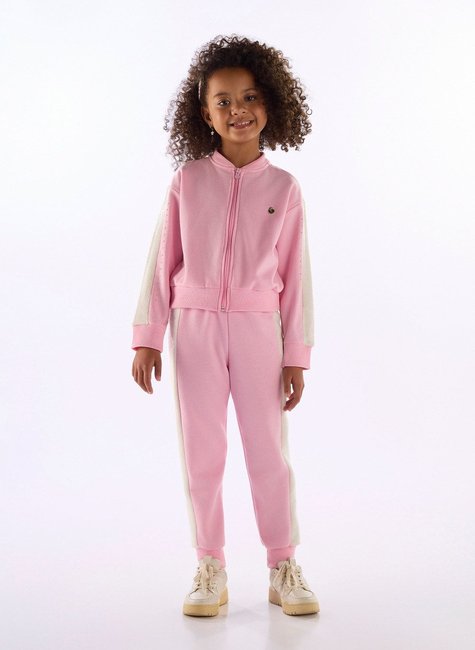 Estilo e conforto se unem neste conjunto de inverno para menina. A jaqueta é confeccionada em moletom felpado (50% algodão, 50% poliéster) com recortes nas mangas em tecido com toque de pelo sintético, zíper frontal aparente e aplicação de medalha decorativa com strass. A calça segue a mesma linha esportiva, com recortes laterais e punhos em molde que garantem ótimo ajuste. Ideal para os dias frios com um visual moderno e aconchegante.