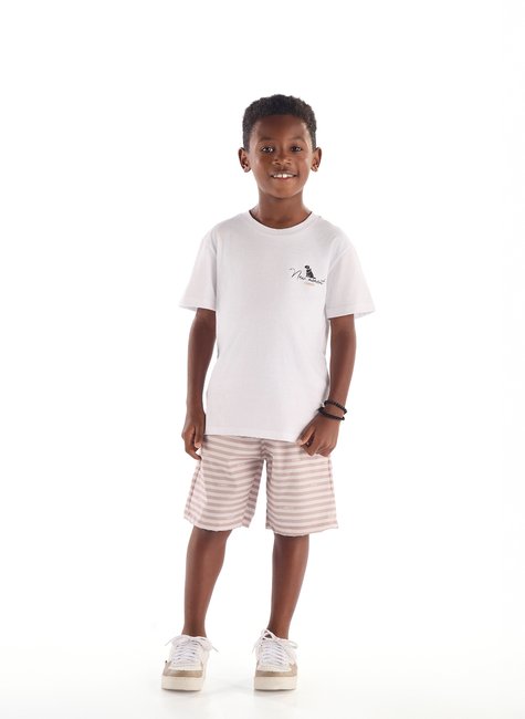 Perfeito para os dias quentes, este conjunto infantil masculino é a união ideal entre conforto e estilo. A camiseta, confeccionada em meia malha (Algodão), proporciona um toque macio e respirável, trazendo estampa moderna no peito e gola redonda com acabamento em ribana (Algodão) que valoriza o caimento. Já a bermuda, produzida em microfibra com elastano (Poliéster com elastano), exibe estampa sublimada listrada e conta com cós elástico, cadarço funcional e bolsos laterais, garantindo praticidade e liberdade total nos movimentos. Leve, despojado e versátil, é o look perfeito para acompanhar os meninos em dias de sol, brincadeiras e momentos de diversão.