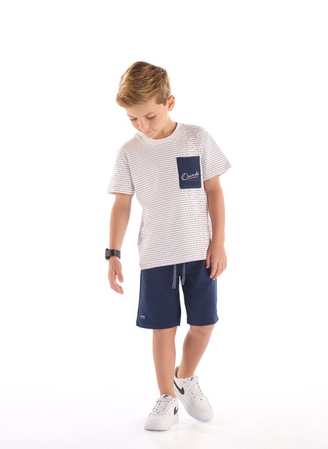 Esse conjunto infantil para menino é a escolha ideal para unir conforto e estilo no dia a dia. A camiseta em cotton listrado (Algodão, poliéster e elastano) traz visual moderno, com bolso aplicado em moletom sem felpa e estampa localizada (Algodão com poliéster). Possui gola aredondada de ribana (Algodão). A bermuda em moletom sem felpa (algodão e poliéster) garante maciez ao toque e liberdade de movimentos, com cós elástico, cadarço decorativo e bolsos funcionais. Um look prático e versátil para brincar, passear ou curtir momentos em família.